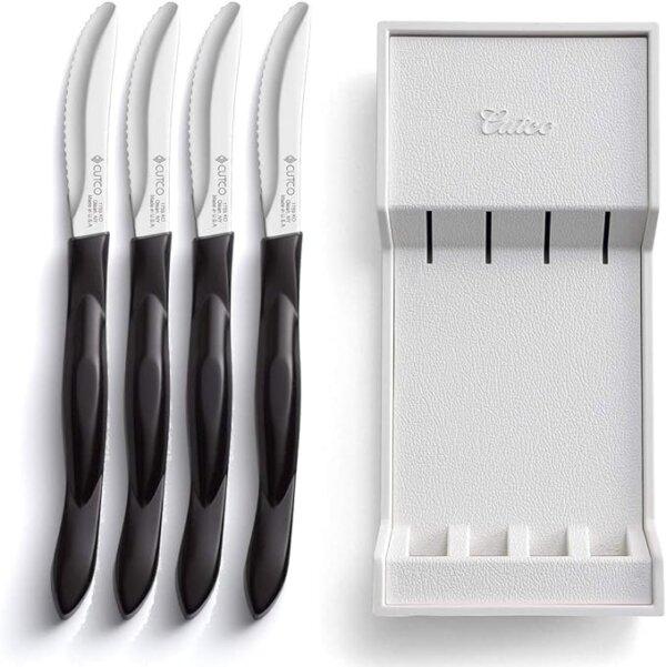 Elevate your outdoor space with the POLYWOOD Presidential Rocking Chair in sleek black. Designed for ultimate relaxation, this rocker boasts a contoured seat, wide arms, and back-friendly slats. Say goodbye to common wood issues as this chair neither splinters, cracks, chips, peels, nor rots, even under environmental stresses. Forget about tedious maintenance tasks like painting or staining; this rocking chair remains pristine without them. It effortlessly repels stains, including wine and condiments, ensuring a clean look with just soap and water. Proudly made in the USA, this chair isn’t just a purchase; it’s an investment backed by a 20-year limited residential warranty.Table Knives from Cutco
