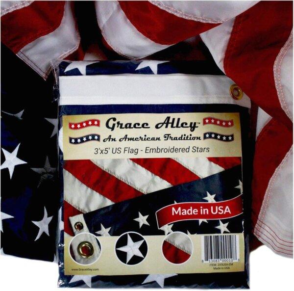 Let our Grace Alley American Flag 3×5 Outdoor display show off your American pride! Made right here in the USA with certified FMAA materials this flag is crafted from durable Durawavez Nylon ensuring it withstands harsh outdoor conditions; Polyester Heading Four Point Needle Fly Hem & Brass Grommets are just some examples of how we’ve gone above and beyond to make sure our flags last longer than others on the market today. The stars have been embroidered while stripes were stitched together showing top notch workmanship so don’t be embarrassed about flying Ol’ Glory high because she deserves nothing less! This vibrant flag is UV and fade resistant which means it can be used in all weather conditions whether rainy or sunny at Memorial Day Veterans Day etc., It also makes an excellent gift for veterans too. American pride never looked so good, order yours now!