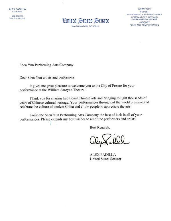 In the welcome letter sent by California Senator Alex Padilla, he wished Shen Yun “the best of luck” in all its performances and thanked them for “sharing traditional Chinese arts and bringing to light thousands of years of Chinese cultural heritage.”