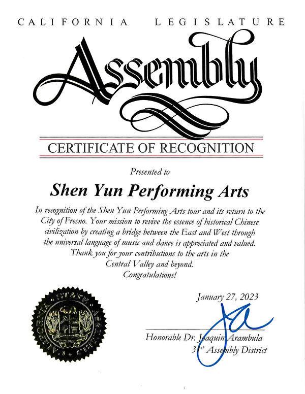 Last but not least, Dr. Joaquin Arambula of California’s legislature assembly issued a certificate honoring Shen Yun. In addition to letting the artists know that their efforts are “appreciated and valued,” he extended his thanks and congratulations to the company for their “contribution to the arts in Central Valley and beyond.”