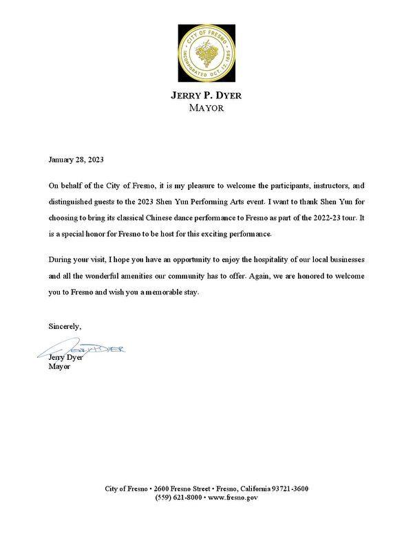 The mayor extended his thanks to Shen Yun artists “for choosing to bring its classical Chinese dance performance to Fresno.” He added in his letter that “it is a special honor for Fresno to be host for this exciting performance.”