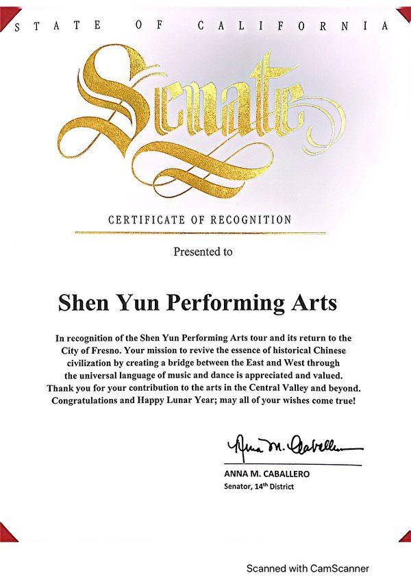 On the same day, Senator Anna M. Caballero’s Certificate of Recognition wished Shen Yun a happy Lunar New Year while applauding the company’s “mission to revive the essence of historical Chinese civilization by creating a bridge between the East and West through the universal language of music and dance.”